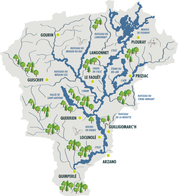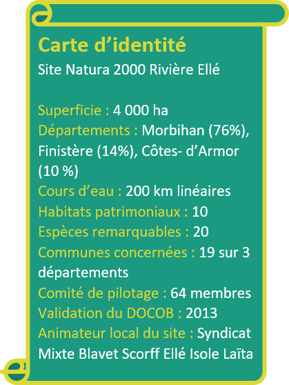 Le site Natura 2000 Rivière Ellé Carte illustrée du site Natura 2000 Rivière Ellé (format image) Cartes du site Natura 2000 Rivière Ellé au 1/100 000 (pdf) Périmètre Natura 2000 en format SIG Formulaire standard de données (FSD) du site Natura 2000 Rivière Ellé